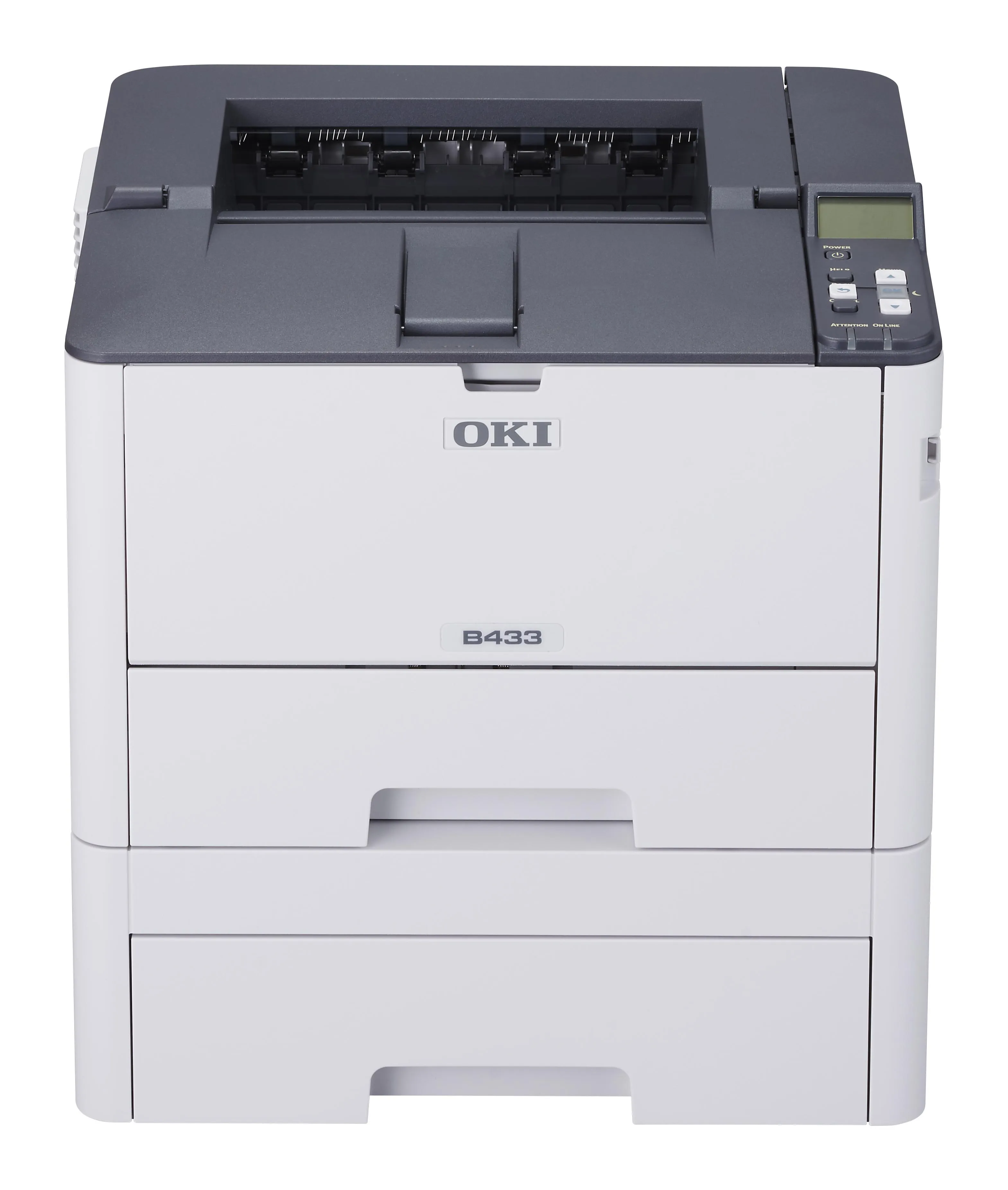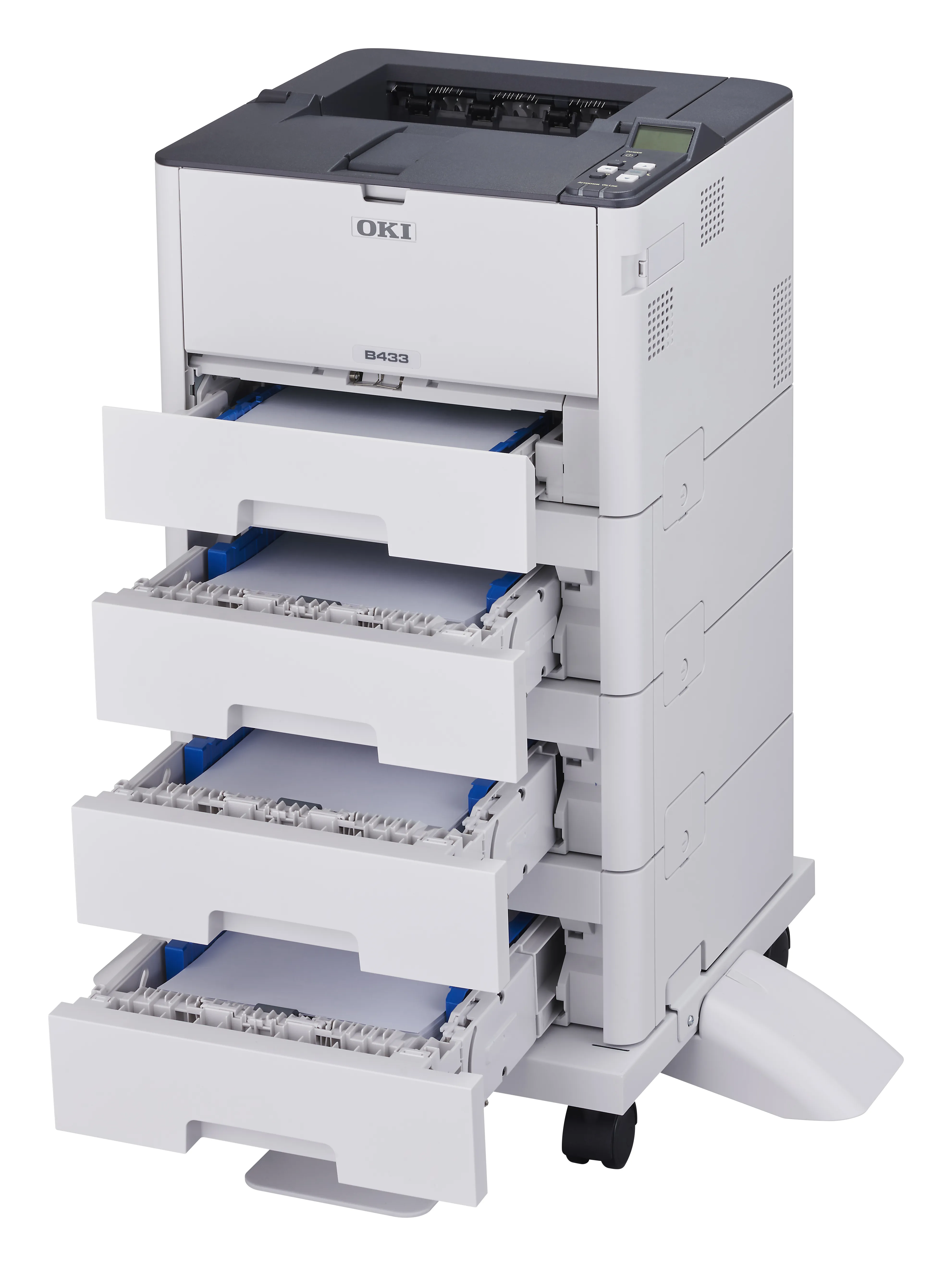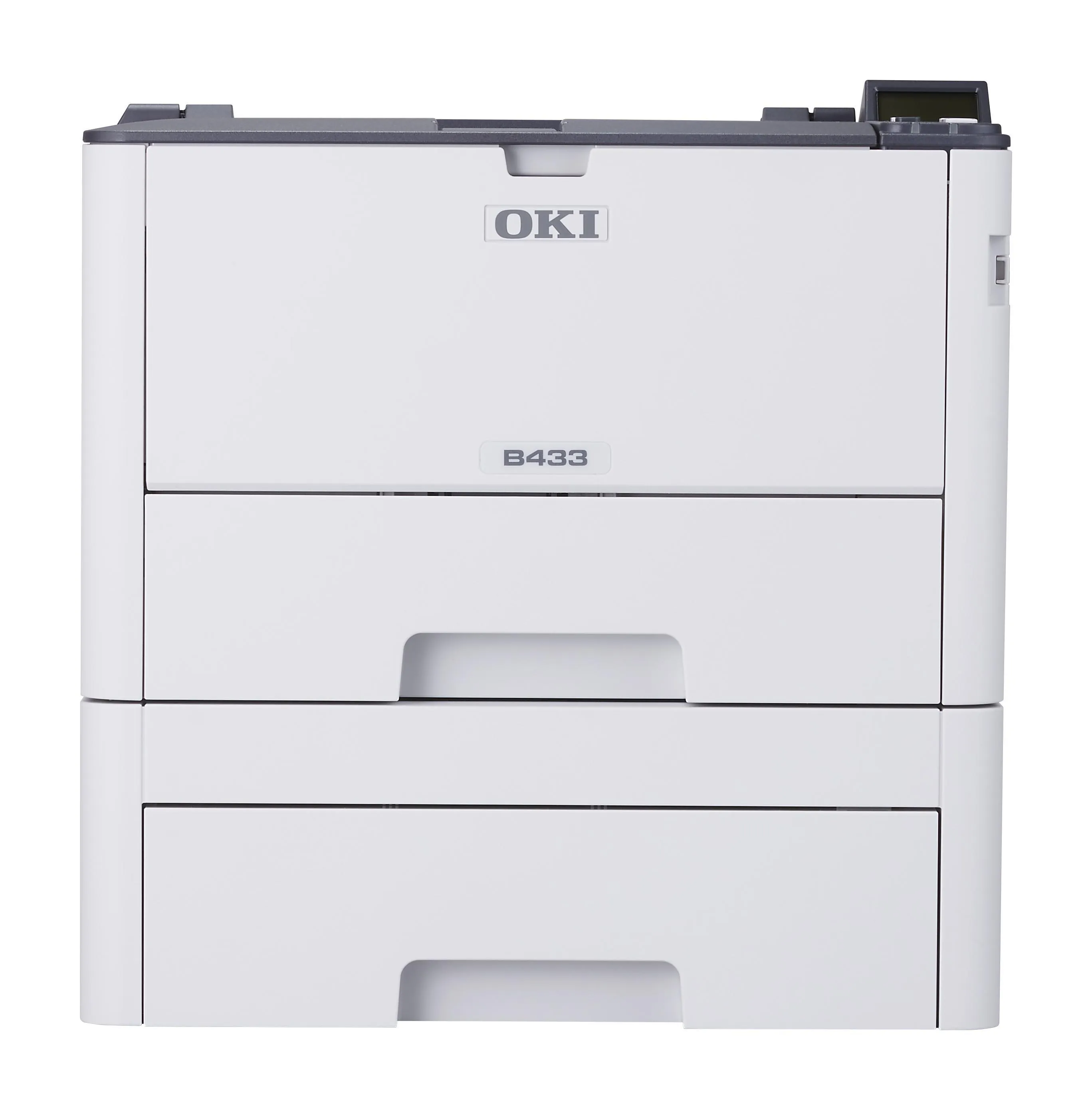 OKI B433 delivers fast 40 ppm mono printing with 1200 × 1200 dpi quality, standard duplex and Gigabit Ethernet. Optional Wi-Fi and a 530-sheet second tray let you scale the device as workloads increase.